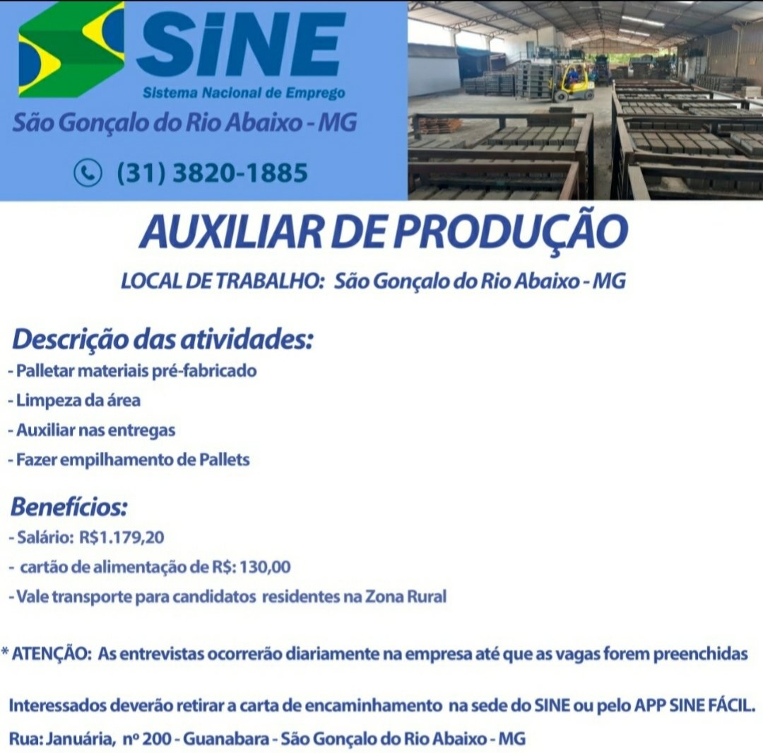 Médio Piracicaba Vaga de Emprego. SINE São Gonçalo do Rio Abaixo MG. Boa sorte aos candidatos. 22 de novembro de 2021 portaldomediopiracicaba@gmail.com Redação