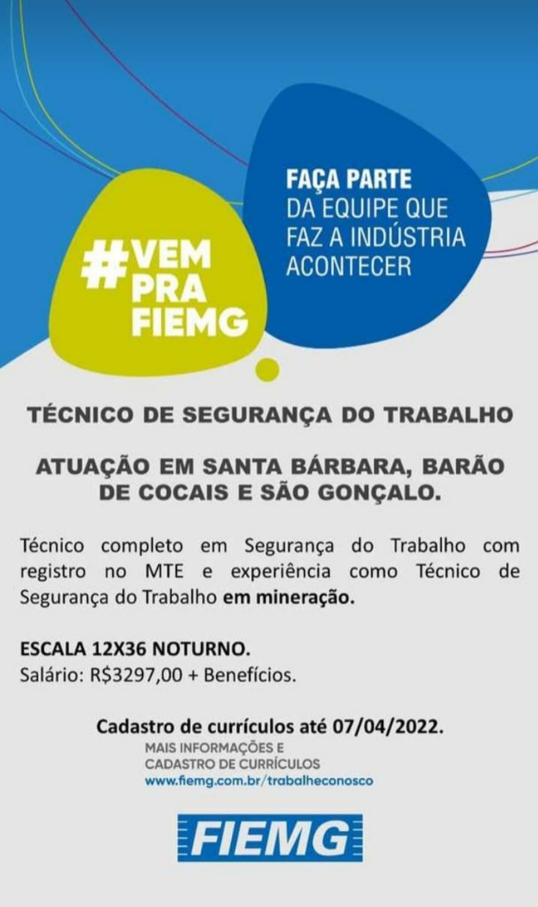 Médio Piracicaba Vaga de Emprego Técnico em Segurança do Trabalho, Barão de Cocais, Santa Barbara e São Gonçalo do Rio Abaixo incrições até dia 07/04 5 de abril de 2022 portaldomediopiracicaba@gmail.com Redação