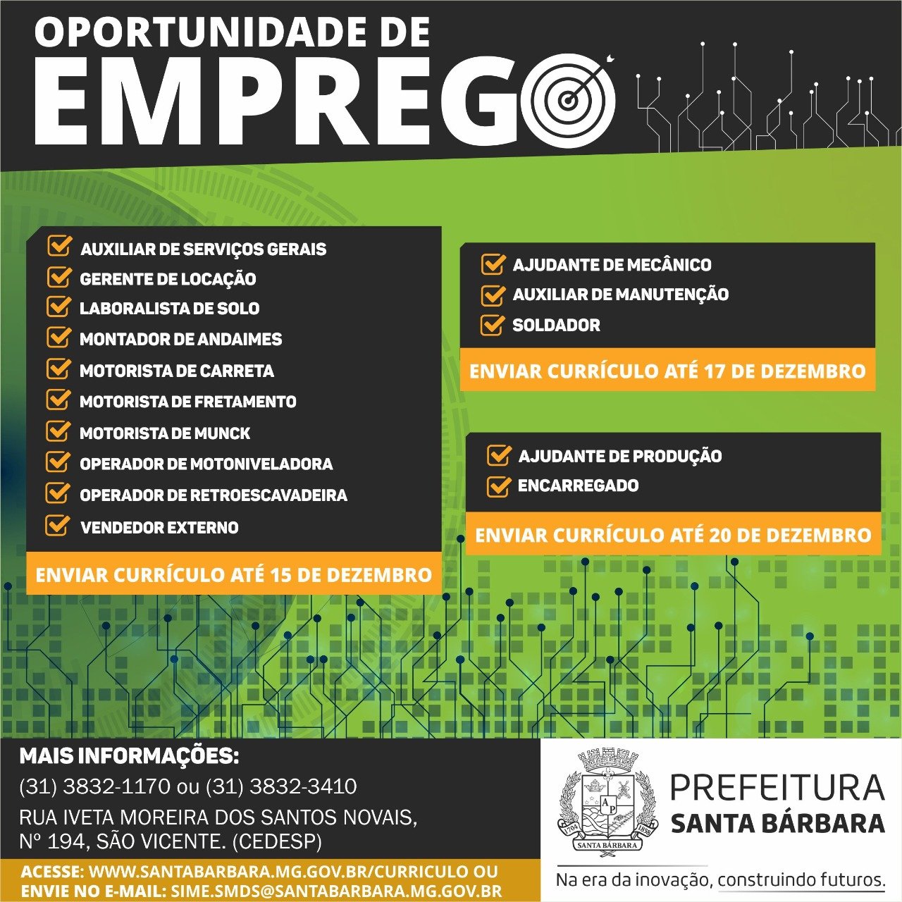 Médio Piracicaba Vagas de emprego até 20/12 Santa Barbara MG 9 de dezembro de 2021 portaldomediopiracicaba@gmail.com Redação