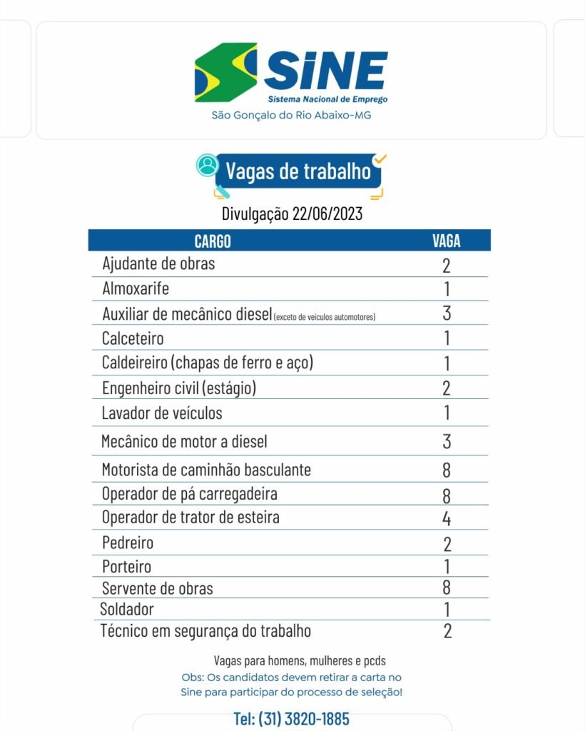 VAGAS DE EMPREGO NO SINE SÃO GONÇALO DO RIO ABAIXO (BOA SORTE AOS CANDIDATOS)
