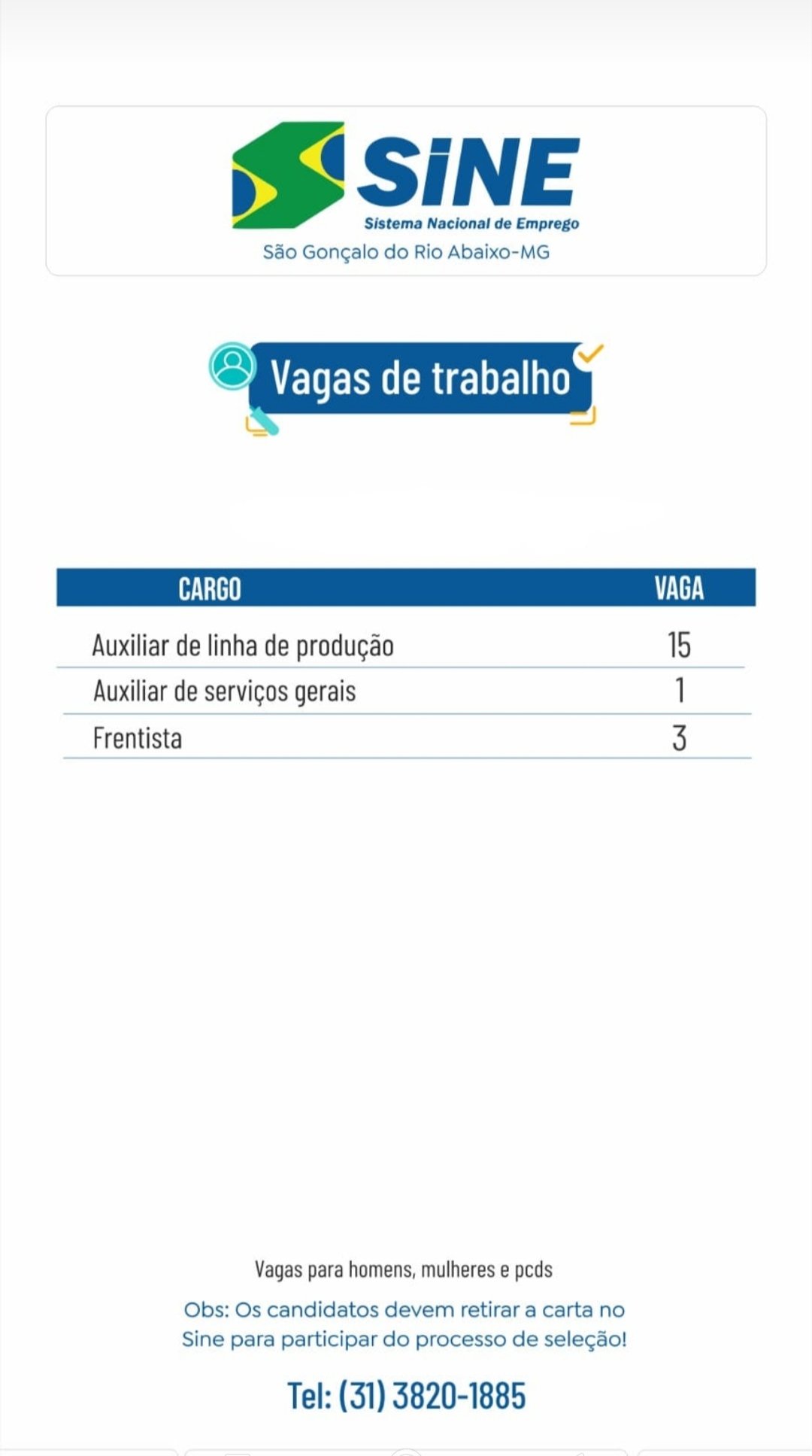 Vagas de emprego no SINE São Gonçalo do Rio Abaixo (#compartilhe)