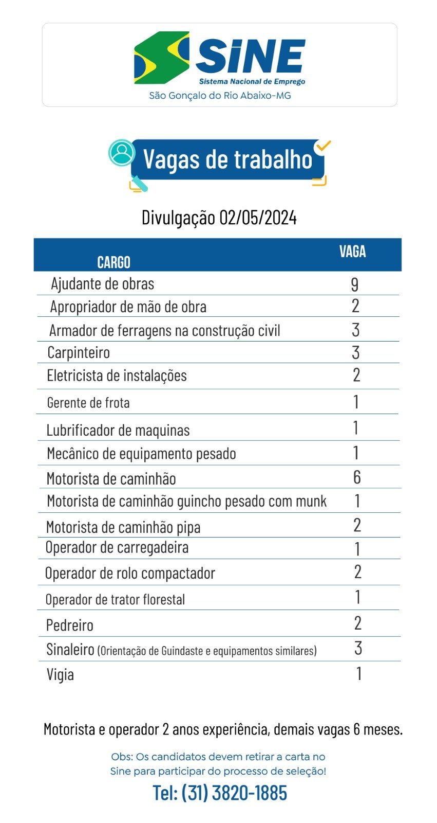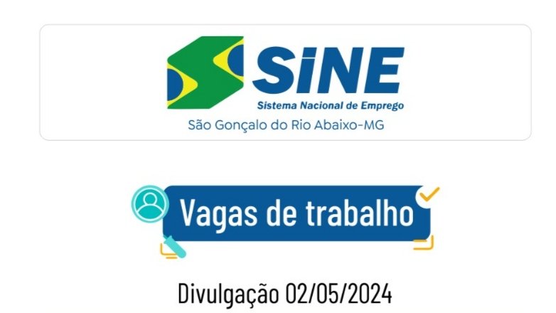Médio Piracicaba Vagas de emprego no SINE São Gonçalo do Rio Abaixo MG (Boa sorte aos candidatos) 3 de maio de 2024 portaldomediopiracicaba@gmail.com Redação