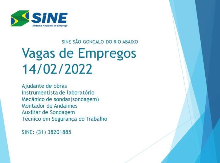 Médio Piracicaba Vagas de Emprego no SINE São Gonçalo do Rio Abaixo MG Boa sorte aos candidatos 14 de fevereiro de 2022 portaldomediopiracicaba@gmail.com Redação