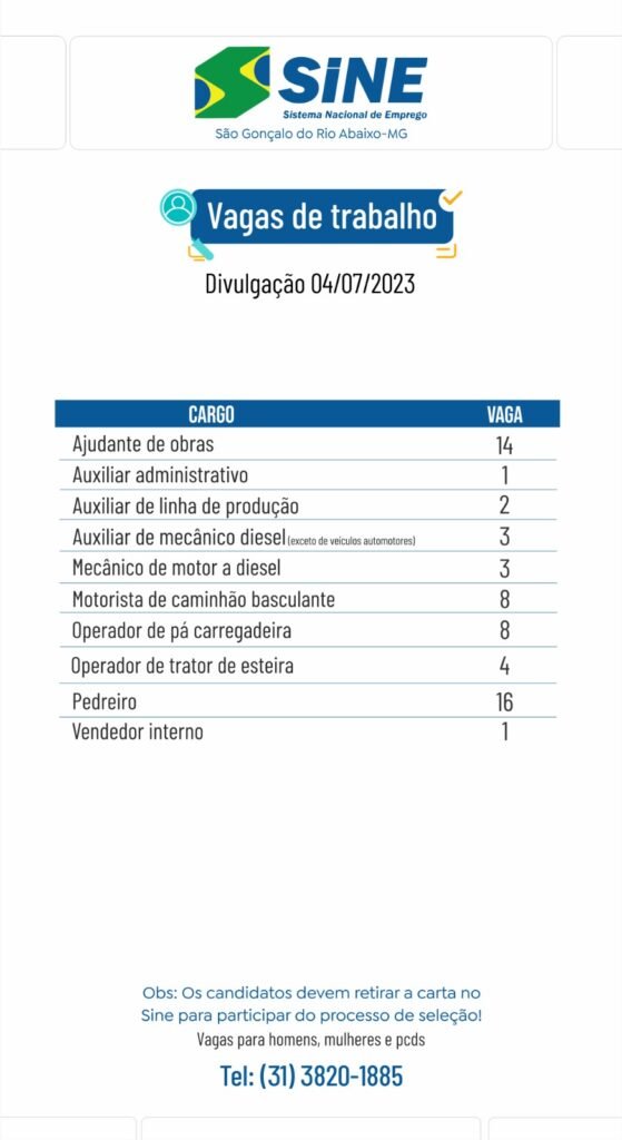VAGAS DE EMPREGO NO SINE SÃO GONÇALO DO RIO ABAIXO (BOA SORTE AOS CANDIDATOS)