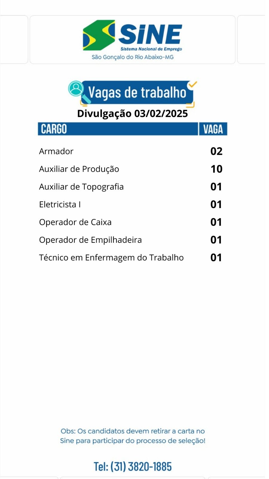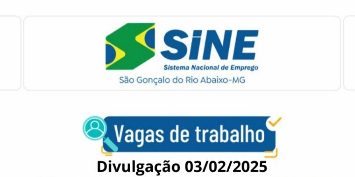 Vagas de emprego para hoje (03/02) no SINE São Gonçalo do Rio Abaixo (corre lá)