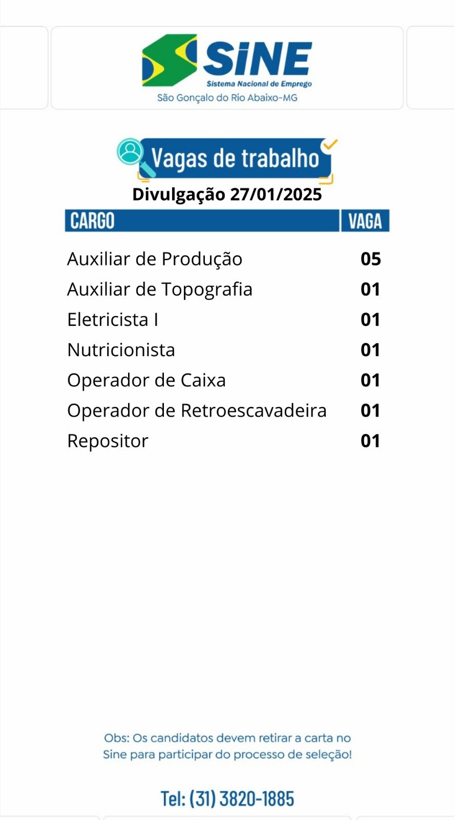 Médio Piracicaba Vagas de emprego para hoje dia 27/01 no SINE São Gonçalo do Rio Abaixo (corre lá) 27 de janeiro de 2025 portaldomediopiracicaba@gmail.com Redação