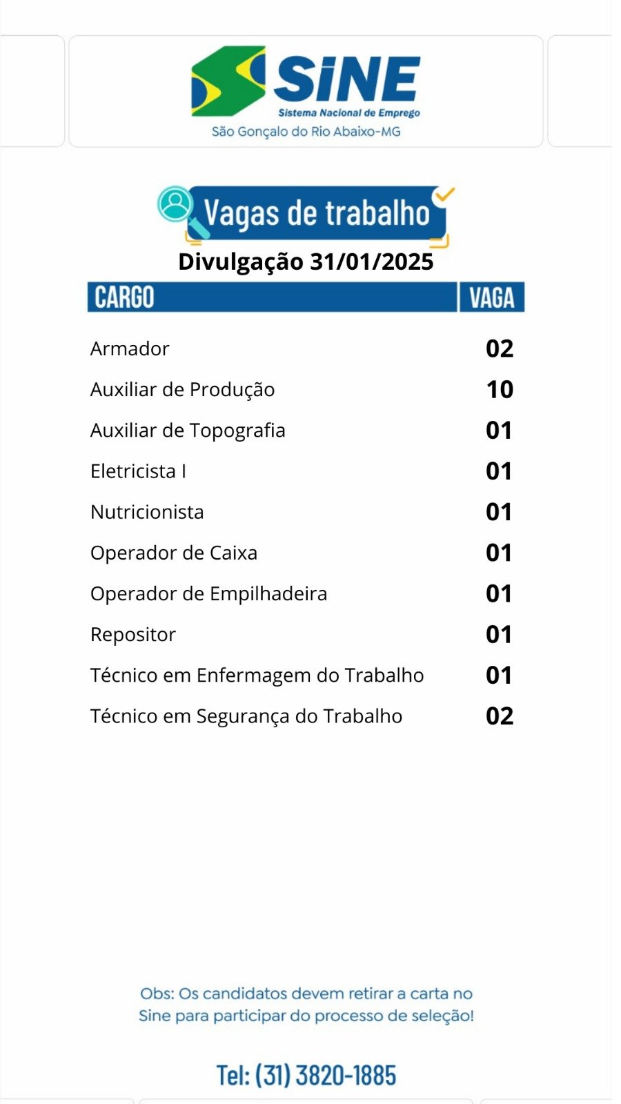 Vagas de emprego para hoje no SINE São Gonçalo do Rio Abaixo (Boa sorte aos candidatos)