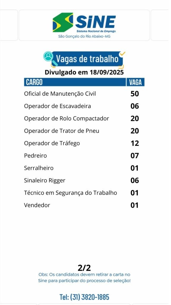 VAGAS DE EMPREGO PARA HOJE NO SINE SÃO GONÇALO DO RIO ABAIXO (#COMPARTILHE)