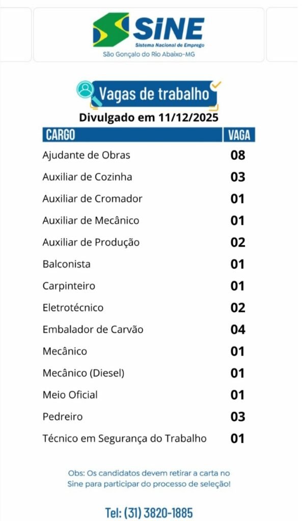 Vagas de emprego para hoje quinta-feira (11) no SINE São Gonçalo do Rio Abaixo (Boa sorte aos candidatos)