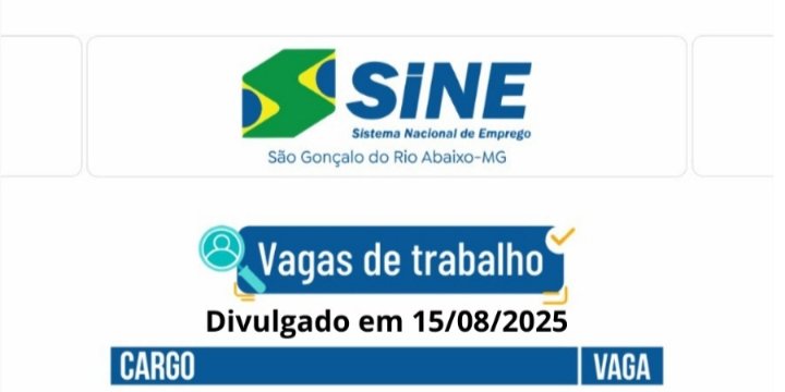 Médio Piracicaba Vagas de emprego para hoje sexta-feira (15/08) no SINE São Gonçalo do Rio Abaixo (#compartilhe) 15 de agosto de 2025 portaldomediopiracicaba@gmail.com Redação