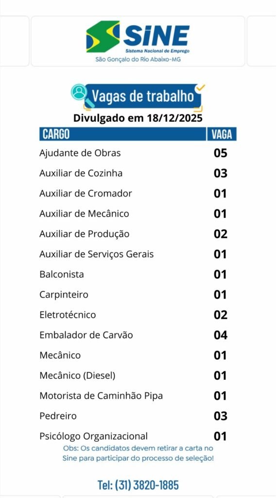 Médio Piracicaba VAGAS DE EMPREGO PARA HOJE, SEXTA-FEIRA (19) DE DEZEMBRO NO SINE SÃO GONÇALO DO RIO ABAIXO (BOA SORTE AOS CANDIDATOS) 19 de dezembro de 2025 portaldomediopiracicaba@gmail.com Redação