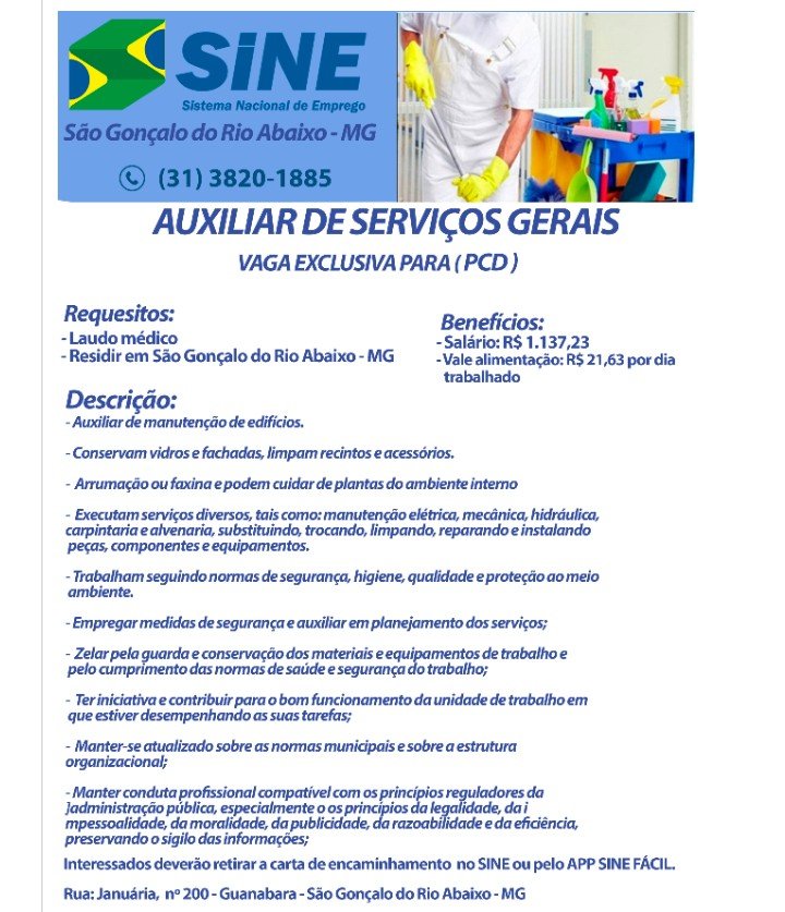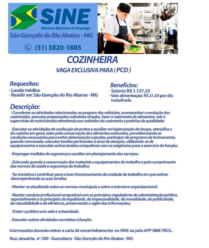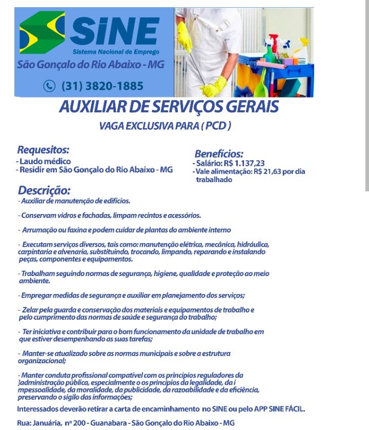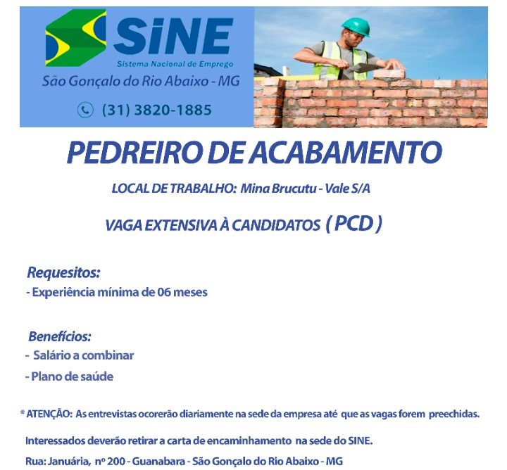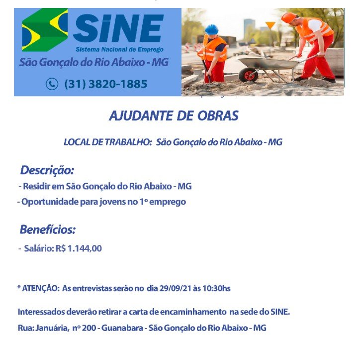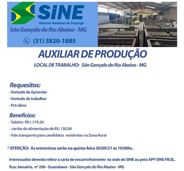 Vagas de Empregos SINE São Gonçalo do Rio Abaixo MG 29/09/2021