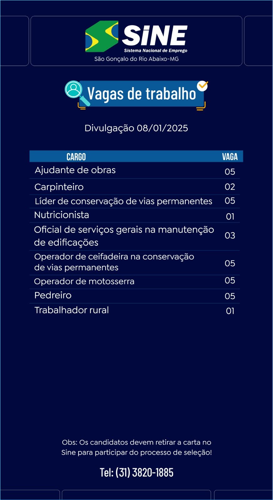 Várias vagas de emprego no SINE São Gonçalo do Rio Abaixo (Boa sorte aos candidatos)