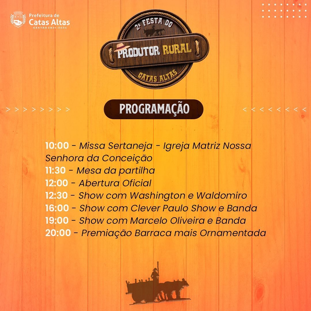 A 2ª Festa do Produtor Rural de Catas Altas é uma realização da Prefeitura, por meio da Secretaria de Agricultura e Meio Ambiente e Secretaria de Turismo e Cultura, em parceria com a EMATER.