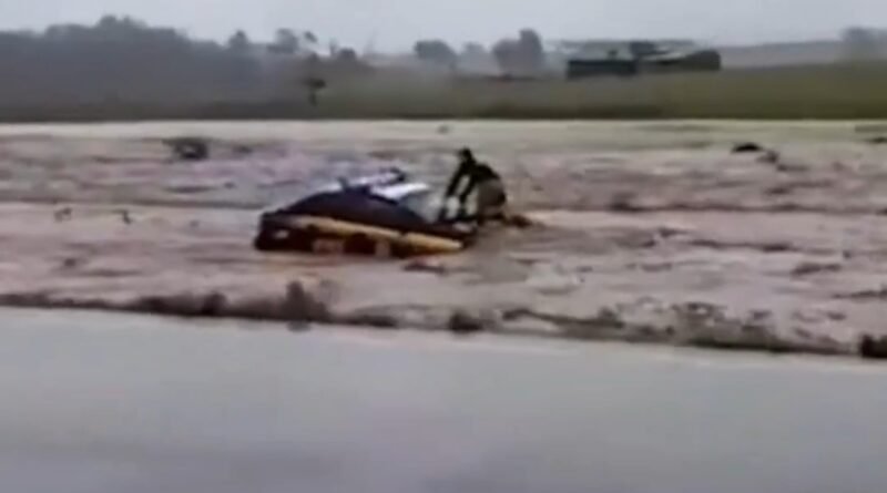 Uma viatura da Polícia Rodoviária Federal (PRF) foi arrastada por uma correnteza durante um alagamento em Camaquã, na região Sudeste do Rio Grande do Sul, na manhã desta quarta-feira (13).