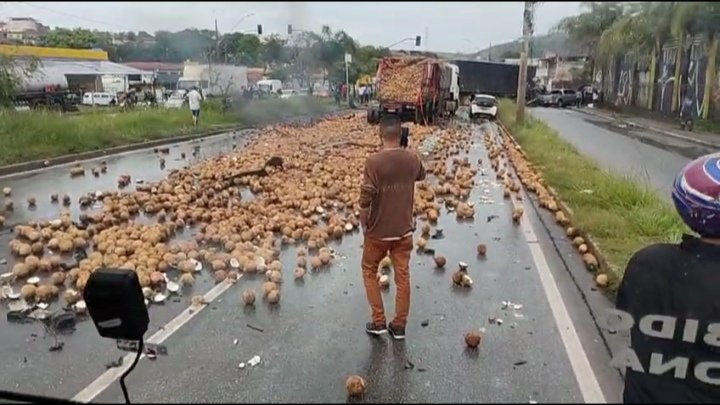 Um dos caminhões estava carregado de cocos, que ficaram espalhados pela pista.