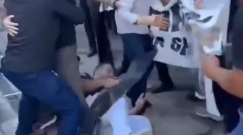 A confusão foi enorme, um empurra daqui, uns chutes ali, faixas rasgadas, manifestantes sentados e deitados na frente da comitiva, os seguranças do governador trabalhando bastante.
